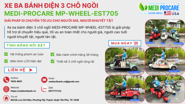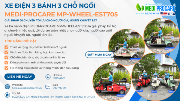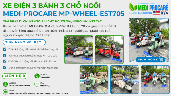 Xe điện 3 bánh, xe ba bánh điện, xe máy điện 3 bánh giá rẻ cho người già, người khuyết tật MEDI-PROCARE MP-WHEEL-EST705 là dòng xe ba bánh điện 3 chỗ ngồi cao cấp, được sản xuất theo công nghệ hiện đại của Hoa Kỳ.
